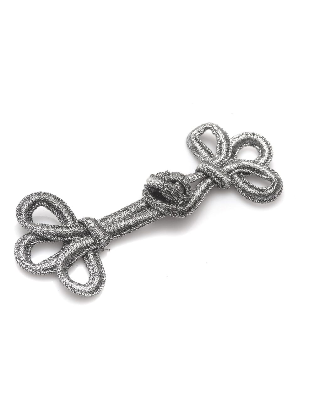 Alamari passamaneria lamè, chiusura ad alamaro realizzato interamente a mano, terminale di forma classica, ideale per abbigliamento, divise e complementi d'arredo. Misura unica.