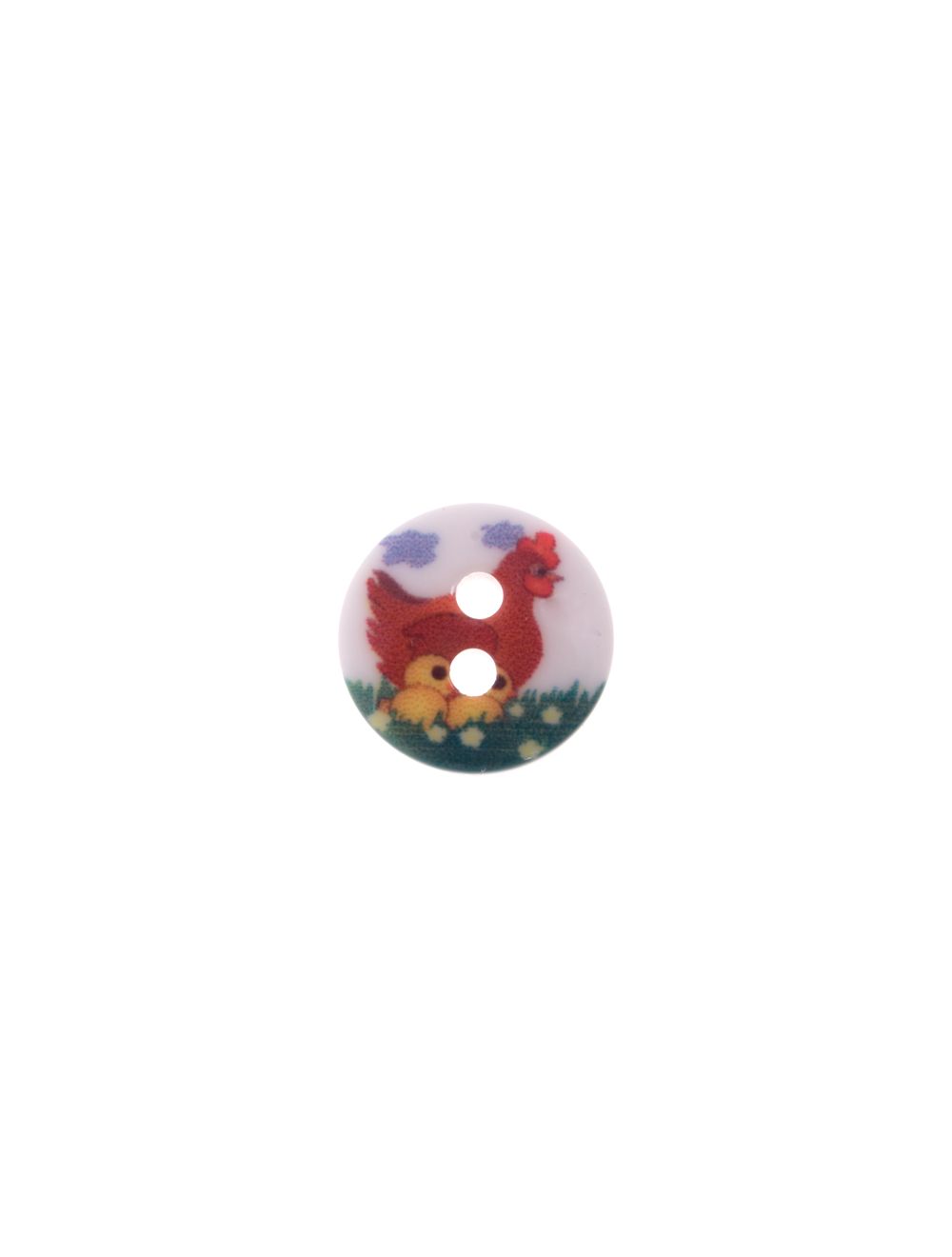 Bottone bambino/decorativo con 2 fori, forma piattina con disegno gallina con pulcini finitura lucido