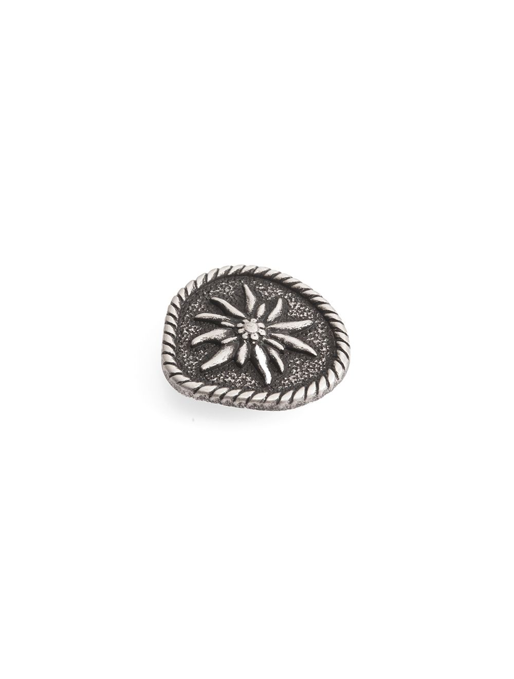Bottone metallo gambo tirolese con stella alpina, disponibile in argento vecchio, misure Lin. 28-36-44