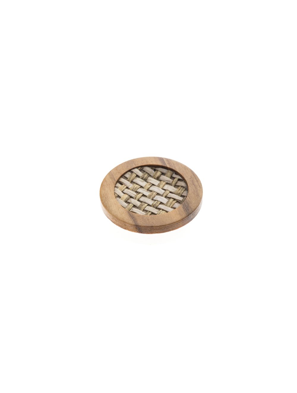 Bottone con gambo in legno ulivo, formato da due pezzi bordo piatto in olivo e inserto in rafia disponibile nei lineati 28-36-44