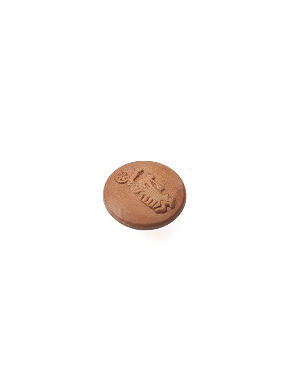 Bottone in vero cuoio con gambo, disegno centrale di un carro con i buoi, disponibile nei lineati 28